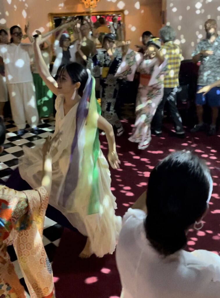 後半は、皆さんが輪になって盆踊りをした後の中心で、ダイナミック琉球という曲に合わせて大太鼓と共にエイサー風に舞いました。エイサーは、沖縄の旧盆の最終日に行われる伝統的な念仏踊りで、先祖をあの世へ送り出す大切な行事です。