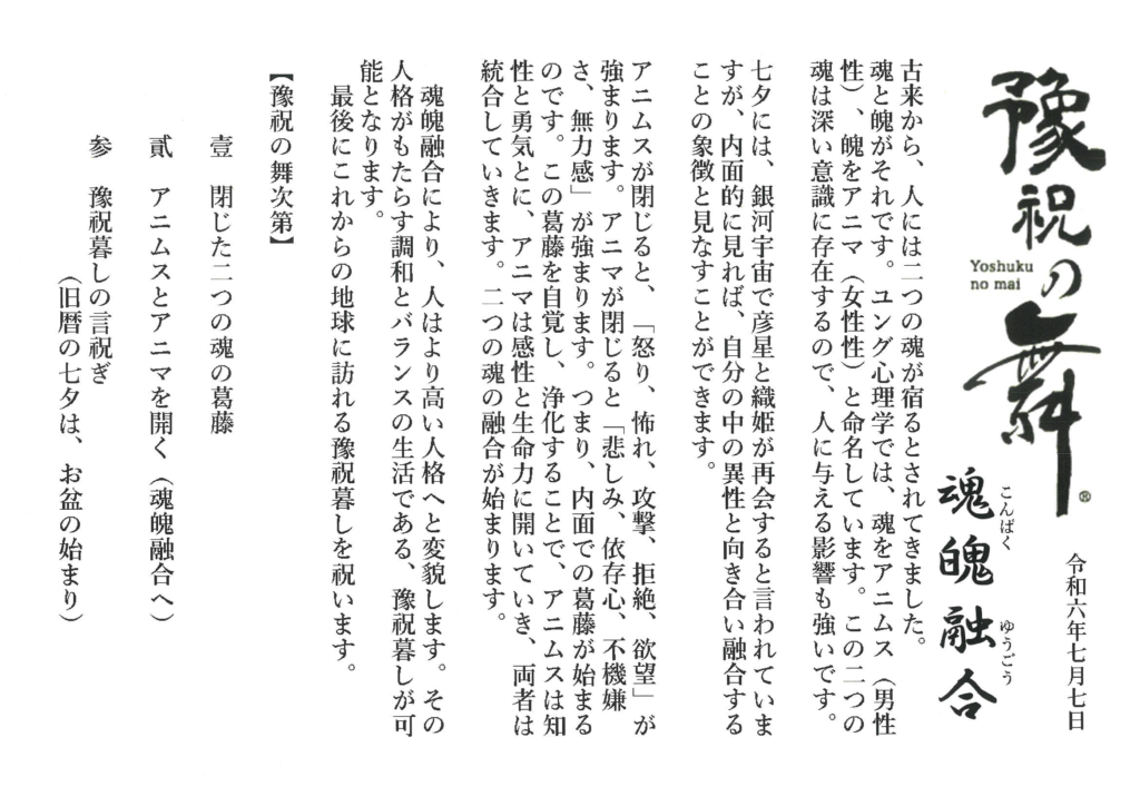 心理学者のカール・ユングによれば、どんな人にも内面には、魂(こん:アニムス・男性性)と魄(はく:アニマ・女性性)の両面があります。七夕での織姫と彦星の出会いは、内なる異性の出会いの象徴だと解釈しました。